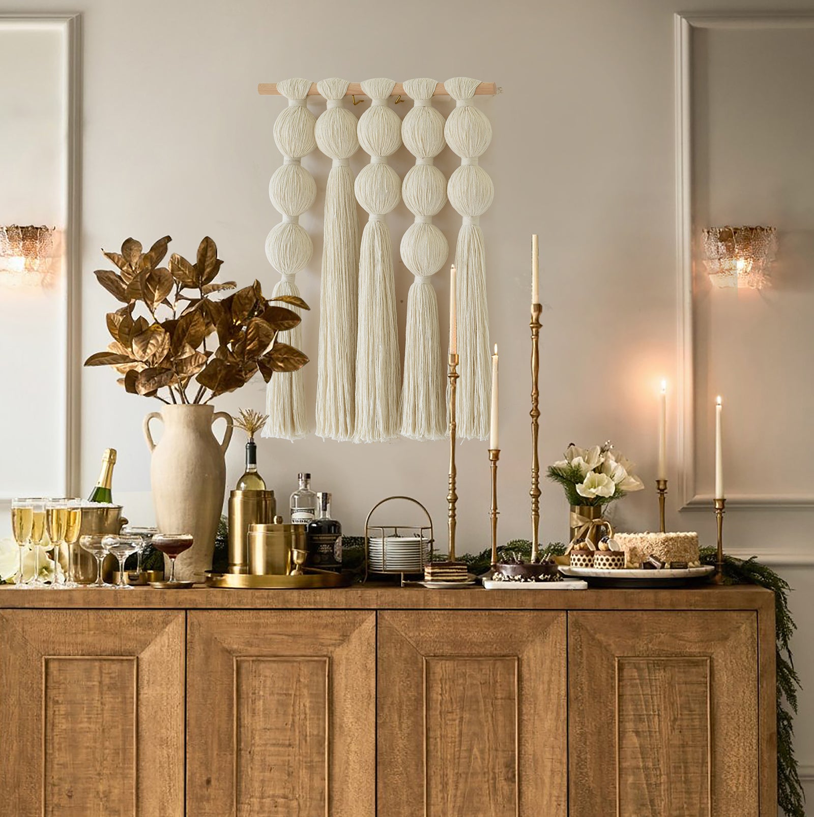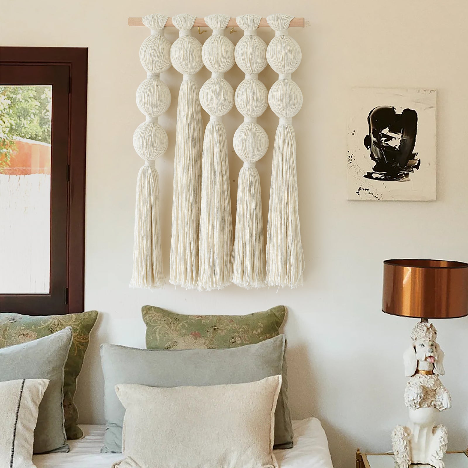 Handwoven with spherical cotton yarn accents, this macrame wall hanging creates a modern, textural focal point perfect for boho wall decor, minimalist design, Nordic-style interiors, or rustic wall art. A sculptural piece that enhances any living space.
